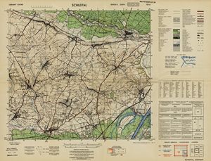 Hier finden Sie ein Meßtischblätter 1:25.000, von Deutschland, aus der Zeit der 1930er Jahre. Diese Karte wurde von Amerikanern damals bei Eisenschmidt gekauft und wurde in den USA für das amerikanische, später britische und französische Militär, bearbeitet. Überarbeitet in Form von Färbungen und Markierungen wurden diese Karten bis in die 50er Jahre.