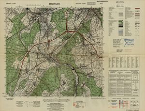 Hier finden Sie ein Meßtischblätter 1:25.000, von Deutschland, aus der Zeit der 1930er Jahre. Diese Karte wurde von Amerikanern damals bei Eisenschmidt gekauft und wurde in den USA für das amerikanische, später britische und französische Militär, bearbeitet. Überarbeitet in Form von Färbungen und Markierungen wurden diese Karten bis in die 50er Jahre.