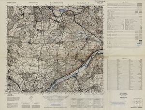 Hier finden Sie ein Meßtischblätter 1:25.000, von Deutschland, aus der Zeit der 1930er Jahre. Diese Karte wurde von Amerikanern damals bei Eisenschmidt gekauft und wurde in den USA für das amerikanische, später britische und französische Militär, bearbeitet. Überarbeitet in Form von Färbungen und Markierungen wurden diese Karten bis in die 50er Jahre.