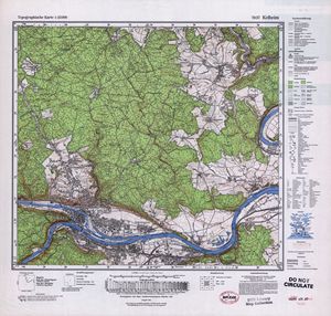 Hier finden Sie ein Meßtischblätter 1:25.000, von Deutschland, aus der Zeit der 1930er Jahre. Diese Karte wurde von Amerikanern damals bei Eisenschmidt gekauft und wurde in den USA für das amerikanische, später britische und französische Militär, bearbeitet. Überarbeitet in Form von Färbungen und Markierungen wurden diese Karten bis in die 50er Jahre.
