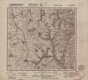 Hier finden Sie ein Meßtischblätter 1:25.000, von Deutschland, aus der Zeit der 1930er Jahre. Diese Karte wurde von Amerikanern damals bei Eisenschmidt gekauft und wurde in den USA für das amerikanische, später britische und französische Militär, bearbeitet. Überarbeitet in Form von Färbungen und Markierungen wurden diese Karten bis in die 50er Jahre.