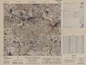 Hier finden Sie ein Meßtischblätter 1:25.000, von Deutschland, aus der Zeit der 1930er Jahre. Diese Karte wurde von Amerikanern damals bei Eisenschmidt gekauft und wurde in den USA für das amerikanische, später britische und französische Militär, bearbeitet. Überarbeitet in Form von Färbungen und Markierungen wurden diese Karten bis in die 50er Jahre.