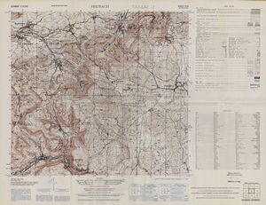 Hier finden Sie ein Meßtischblätter 1:25.000, von Deutschland, aus der Zeit der 1930er Jahre. Diese Karte wurde von Amerikanern damals bei Eisenschmidt gekauft und wurde in den USA für das amerikanische, später britische und französische Militär, bearbeitet. Überarbeitet in Form von Färbungen und Markierungen wurden diese Karten bis in die 50er Jahre.
