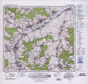Hier finden Sie ein Meßtischblätter 1:25.000, von Deutschland, aus der Zeit der 1930er Jahre. Diese Karte wurde von Amerikanern damals bei Eisenschmidt gekauft und wurde in den USA für das amerikanische, später britische und französische Militär, bearbeitet. Überarbeitet in Form von Färbungen und Markierungen wurden diese Karten bis in die 50er Jahre.