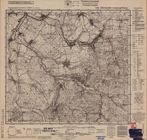 Hier finden Sie ein Meßtischblätter 1:25.000, von Deutschland, aus der Zeit der 1930er Jahre. Diese Karte wurde von Amerikanern damals bei Eisenschmidt gekauft und wurde in den USA für das amerikanische, später britische und französische Militär, bearbeitet. Überarbeitet in Form von Färbungen und Markierungen wurden diese Karten bis in die 50er Jahre.
