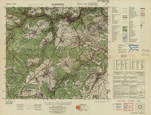 Hier finden Sie ein Meßtischblätter 1:25.000, von Deutschland, aus der Zeit der 1930er Jahre. Diese Karte wurde von Amerikanern damals bei Eisenschmidt gekauft und wurde in den USA für das amerikanische, später britische und französische Militär, bearbeitet. Überarbeitet in Form von Färbungen und Markierungen wurden diese Karten bis in die 50er Jahre.