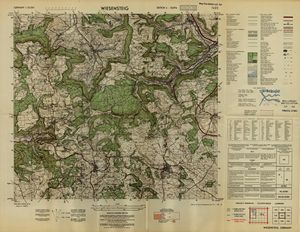 Hier finden Sie ein Meßtischblätter 1:25.000, von Deutschland, aus der Zeit der 1930er Jahre. Diese Karte wurde von Amerikanern damals bei Eisenschmidt gekauft und wurde in den USA für das amerikanische, später britische und französische Militär, bearbeitet. Überarbeitet in Form von Färbungen und Markierungen wurden diese Karten bis in die 50er Jahre.