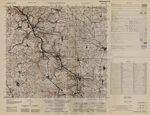 Hier finden Sie ein Meßtischblätter 1:25.000, von Deutschland, aus der Zeit der 1930er Jahre. Diese Karte wurde von Amerikanern damals bei Eisenschmidt gekauft und wurde in den USA für das amerikanische, später britische und französische Militär, bearbeitet. Überarbeitet in Form von Färbungen und Markierungen wurden diese Karten bis in die 50er Jahre.