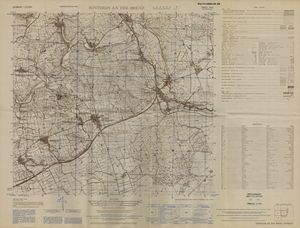Hier finden Sie ein Meßtischblätter 1:25.000, von Deutschland, aus der Zeit der 1930er Jahre. Diese Karte wurde von Amerikanern damals bei Eisenschmidt gekauft und wurde in den USA für das amerikanische, später britische und französische Militär, bearbeitet. Überarbeitet in Form von Färbungen und Markierungen wurden diese Karten bis in die 50er Jahre.