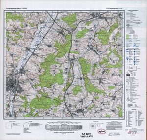 Hier finden Sie ein Meßtischblätter 1:25.000, von Deutschland, aus der Zeit der 1930er Jahre. Diese Karte wurde von Amerikanern damals bei Eisenschmidt gekauft und wurde in den USA für das amerikanische, später britische und französische Militär, bearbeitet. Überarbeitet in Form von Färbungen und Markierungen wurden diese Karten bis in die 50er Jahre.