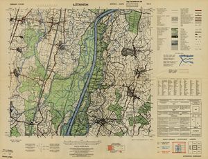 Hier finden Sie ein Meßtischblätter 1:25.000, von Deutschland, aus der Zeit der 1930er Jahre. Diese Karte wurde von Amerikanern damals bei Eisenschmidt gekauft und wurde in den USA für das amerikanische, später britische und französische Militär, bearbeitet. Überarbeitet in Form von Färbungen und Markierungen wurden diese Karten bis in die 50er Jahre.
