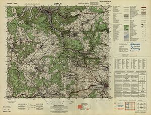 Hier finden Sie ein Meßtischblätter 1:25.000, von Deutschland, aus der Zeit der 1930er Jahre. Diese Karte wurde von Amerikanern damals bei Eisenschmidt gekauft und wurde in den USA für das amerikanische, später britische und französische Militär, bearbeitet. Überarbeitet in Form von Färbungen und Markierungen wurden diese Karten bis in die 50er Jahre.