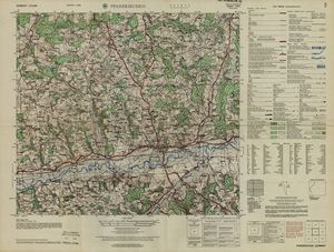 Hier finden Sie ein Meßtischblätter 1:25.000, von Deutschland, aus der Zeit der 1930er Jahre. Diese Karte wurde von Amerikanern damals bei Eisenschmidt gekauft und wurde in den USA für das amerikanische, später britische und französische Militär, bearbeitet. Überarbeitet in Form von Färbungen und Markierungen wurden diese Karten bis in die 50er Jahre.