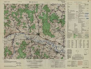 Hier finden Sie ein Meßtischblätter 1:25.000, von Deutschland, aus der Zeit der 1930er Jahre. Diese Karte wurde von Amerikanern damals bei Eisenschmidt gekauft und wurde in den USA für das amerikanische, später britische und französische Militär, bearbeitet. Überarbeitet in Form von Färbungen und Markierungen wurden diese Karten bis in die 50er Jahre.