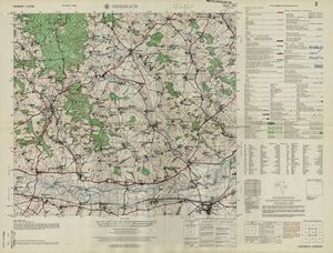 Hier finden Sie ein Meßtischblätter 1:25.000, von Deutschland, aus der Zeit der 1930er Jahre. Diese Karte wurde von Amerikanern damals bei Eisenschmidt gekauft und wurde in den USA für das amerikanische, später britische und französische Militär, bearbeitet. Überarbeitet in Form von Färbungen und Markierungen wurden diese Karten bis in die 50er Jahre.