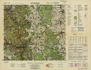 Hier finden Sie ein Meßtischblätter 1:25.000, von Deutschland, aus der Zeit der 1930er Jahre. Diese Karte wurde von Amerikanern damals bei Eisenschmidt gekauft und wurde in den USA für das amerikanische, später britische und französische Militär, bearbeitet. Überarbeitet in Form von Färbungen und Markierungen wurden diese Karten bis in die 50er Jahre.