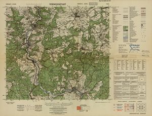 Hier finden Sie ein Meßtischblätter 1:25.000, von Deutschland, aus der Zeit der 1930er Jahre. Diese Karte wurde von Amerikanern damals bei Eisenschmidt gekauft und wurde in den USA für das amerikanische, später britische und französische Militär, bearbeitet. Überarbeitet in Form von Färbungen und Markierungen wurden diese Karten bis in die 50er Jahre.