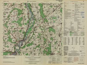 Hier finden Sie ein Meßtischblätter 1:25.000, von Deutschland, aus der Zeit der 1930er Jahre. Diese Karte wurde von Amerikanern damals bei Eisenschmidt gekauft und wurde in den USA für das amerikanische, später britische und französische Militär, bearbeitet. Überarbeitet in Form von Färbungen und Markierungen wurden diese Karten bis in die 50er Jahre.