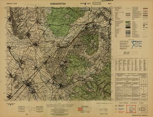 Hier finden Sie ein Meßtischblätter 1:25.000, von Deutschland, aus der Zeit der 1930er Jahre. Diese Karte wurde von Amerikanern damals bei Eisenschmidt gekauft und wurde in den USA für das amerikanische, später britische und französische Militär, bearbeitet. Überarbeitet in Form von Färbungen und Markierungen wurden diese Karten bis in die 50er Jahre.