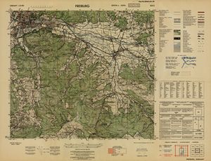Hier finden Sie ein Meßtischblätter 1:25.000, von Deutschland, aus der Zeit der 1930er Jahre. Diese Karte wurde von Amerikanern damals bei Eisenschmidt gekauft und wurde in den USA für das amerikanische, später britische und französische Militär, bearbeitet. Überarbeitet in Form von Färbungen und Markierungen wurden diese Karten bis in die 50er Jahre.