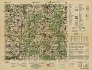 Hier finden Sie ein Meßtischblätter 1:25.000, von Deutschland, aus der Zeit der 1930er Jahre. Diese Karte wurde von Amerikanern damals bei Eisenschmidt gekauft und wurde in den USA für das amerikanische, später britische und französische Militär, bearbeitet. Überarbeitet in Form von Färbungen und Markierungen wurden diese Karten bis in die 50er Jahre.