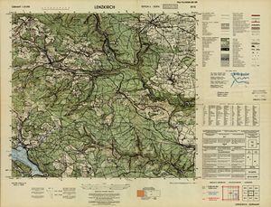 Hier finden Sie ein Meßtischblätter 1:25.000, von Deutschland, aus der Zeit der 1930er Jahre. Diese Karte wurde von Amerikanern damals bei Eisenschmidt gekauft und wurde in den USA für das amerikanische, später britische und französische Militär, bearbeitet. Überarbeitet in Form von Färbungen und Markierungen wurden diese Karten bis in die 50er Jahre.