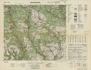 Hier finden Sie ein Meßtischblätter 1:25.000, von Deutschland, aus der Zeit der 1930er Jahre. Diese Karte wurde von Amerikanern damals bei Eisenschmidt gekauft und wurde in den USA für das amerikanische, später britische und französische Militär, bearbeitet. Überarbeitet in Form von Färbungen und Markierungen wurden diese Karten bis in die 50er Jahre.