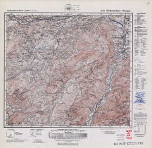 Hier finden Sie ein Meßtischblätter 1:25.000, von Deutschland, aus der Zeit der 1930er Jahre. Diese Karte wurde von Amerikanern damals bei Eisenschmidt gekauft und wurde in den USA für das amerikanische, später britische und französische Militär, bearbeitet. Überarbeitet in Form von Färbungen und Markierungen wurden diese Karten bis in die 50er Jahre.