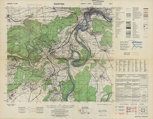 Hier finden Sie ein Meßtischblätter 1:25.000, von Deutschland, aus der Zeit der 1930er Jahre. Diese Karte wurde von Amerikanern damals bei Eisenschmidt gekauft und wurde in den USA für das amerikanische, später britische und französische Militär, bearbeitet. Überarbeitet in Form von Färbungen und Markierungen wurden diese Karten bis in die 50er Jahre.