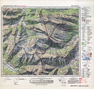 Hier finden Sie ein Meßtischblätter 1:25.000, von Deutschland, aus der Zeit der 1930er Jahre. Diese Karte wurde von Amerikanern damals bei Eisenschmidt gekauft und wurde in den USA für das amerikanische, später britische und französische Militär, bearbeitet. Überarbeitet in Form von Färbungen und Markierungen wurden diese Karten bis in die 50er Jahre.